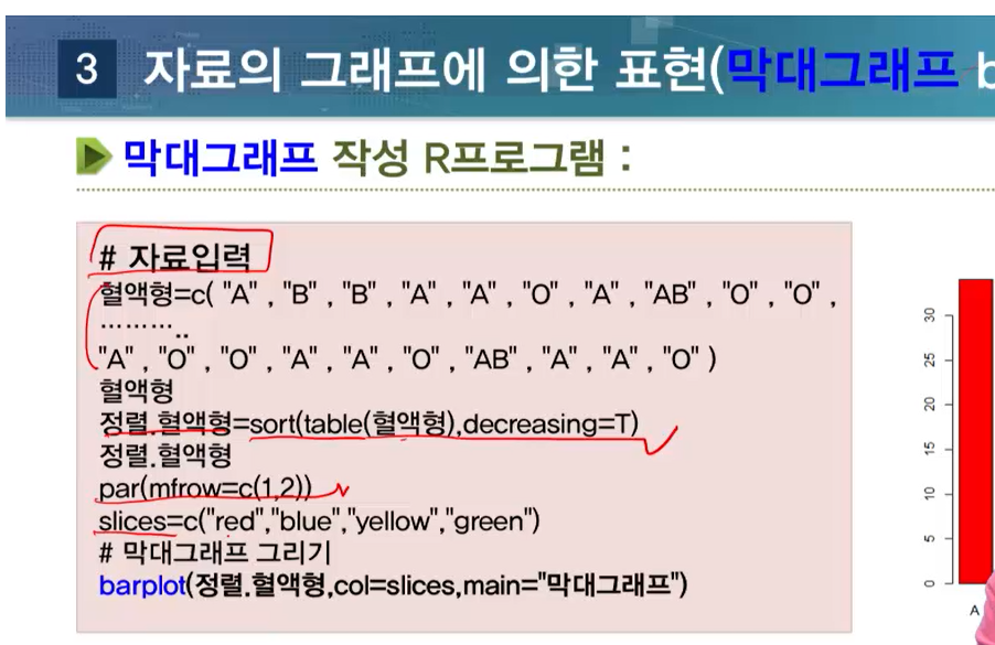 막대 그래프 barplot : 항목별 도수를 막대 상대적인 길이로 표현. 제일 높은 도수 항목 찾을 때 용이